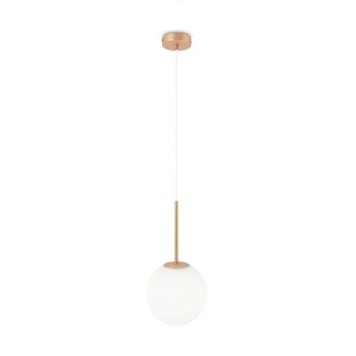 Arany színű fém vázas, minimál stílusú függeszték lámpa gömb alakú, 20cm átmérőjű fagyasztott üveg búrával, E14-es foglalattal, rövidíthető belógással. Fényforrást nem tartalmaz.