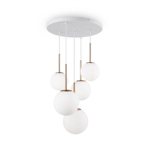 Arany színű fém vázas, minimál stílusú függeszték lámpa gömb alakú(15,18 és 20cm átmérő), fagyasztott üveg búrával, E14-es foglalattal, rövidíthető belógással. Fényforrást nem tartalmaz.