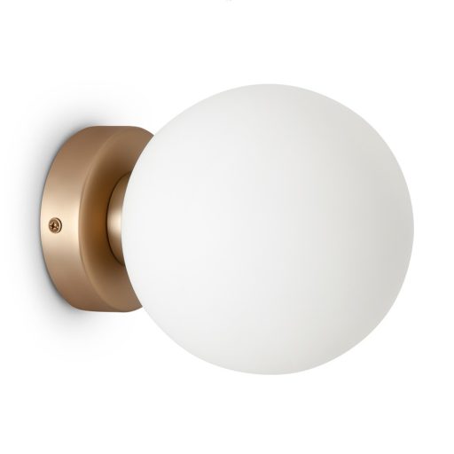Arany színű fém vázas, minimál stílusú fali lámpa gömb alakú, 15cm átmérőjű fagyasztott üveg búrával, E14-es foglalattal. Fényforrást nem tartalmaz.