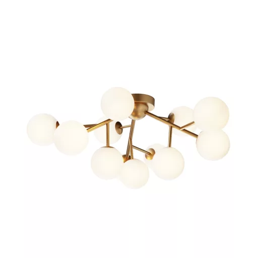 Sárgaréz színű fém vázas mennyezeti lámpa gömb alakú fehér színű üveg búrákkal, 12db G9-es foglalattal. A lámpa fényforrást nem tartalmaz.