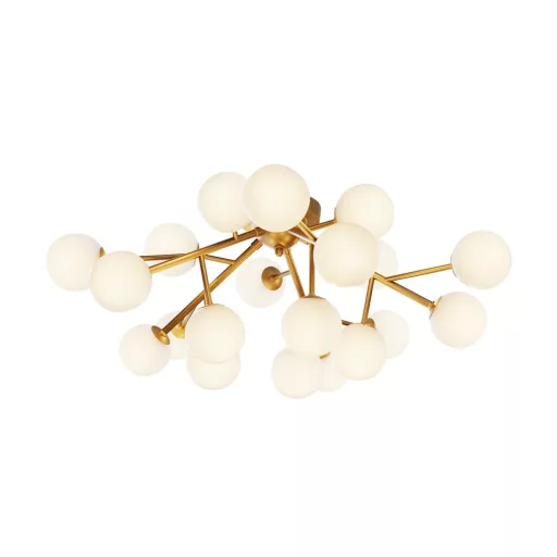 Sárgaréz színű fém vázas mennyezeti lámpa gömb alakú fehér színű üveg búrákkal, 20db G9-es foglalattal. A lámpa fényforrást nem tartalmaz.