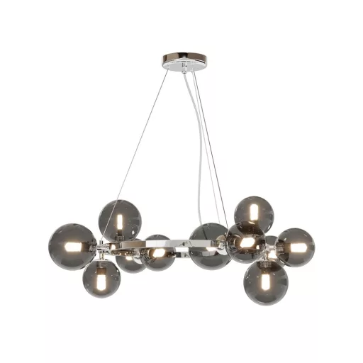 Króm színű fém vázas függeszték lámpa gömb alakú füstszínű, 10 és 12cm átmérőjű üveg búrákkal, 11db G9-es foglalattal, 25-137cm között választható belógással. A lámpa fényforrást nem tartalmaz.