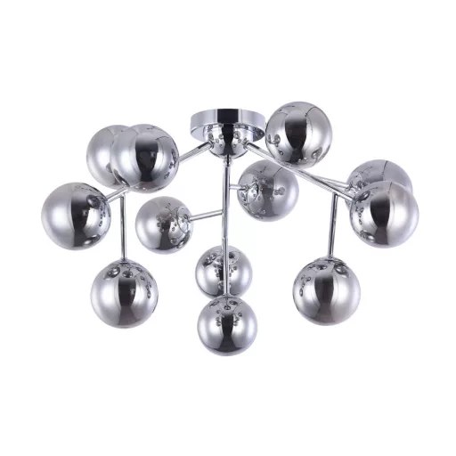 Króm színű fém vázas mennyezeti lámpa gömb alakú, króm színű üveg búrákkal, 12db G9-es foglalattal. A lámpa fényforrást nem tartalmaz.