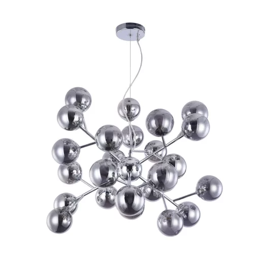 Króm színű fém vázas függeszték lámpa gömb alakú füstszínű üveg búrákkal, 24db G9-es foglalattal, 90-146,5 cm között választható belógással. A lámpa fényforrást nem tartalmaz.