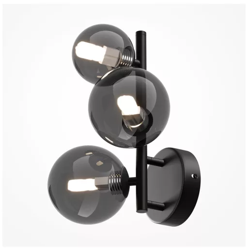 Fekete színű fém vázas fali lámpa gömb alakú áttetsző fekete színű, 2db10cm-es és 1db 8cm átmérőjű üveg búrákkal, 3db G9-es foglalattal. A lámpa fényforrást nem tartalmaz.