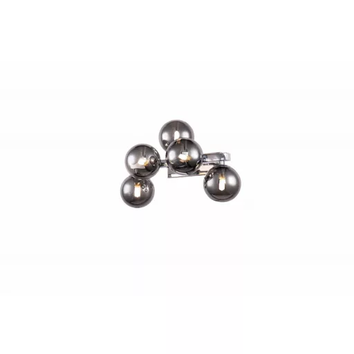 Króm színű fém vázas fali lámpa gömb alakú füstszínű, 10cm átmérőjű üveg búrákkal, 5db G9-es foglalattal. A lámpa fényforrást nem tartalmaz.