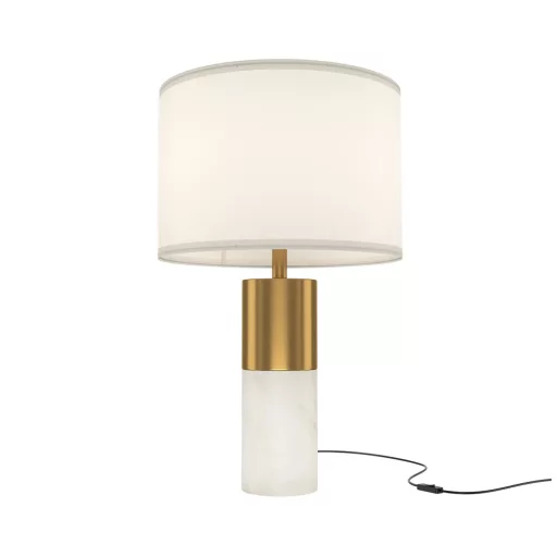 Sárgaréz színű fém vázas asztali lámpa természetes kő betéttel, fehér színű textil bevonatos lámpaernyővel, 1db E27-es foglalattal, vezetékre szerelt kapcsolóval. A lámpát fényforrás nélkül szállítjuk.