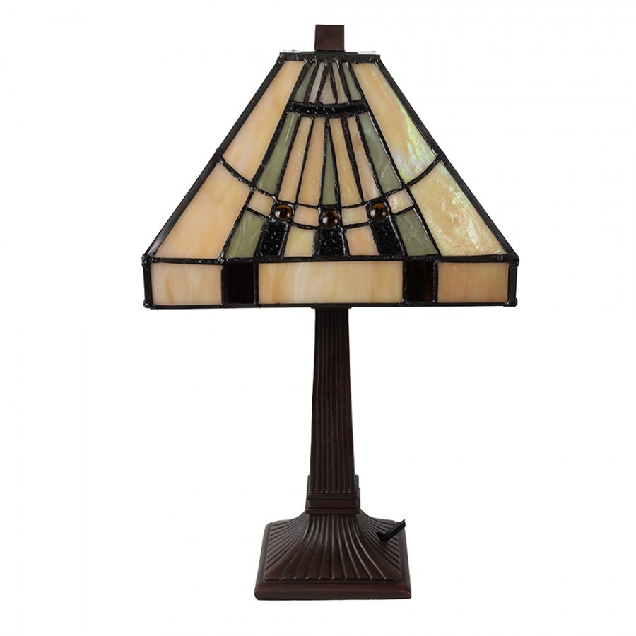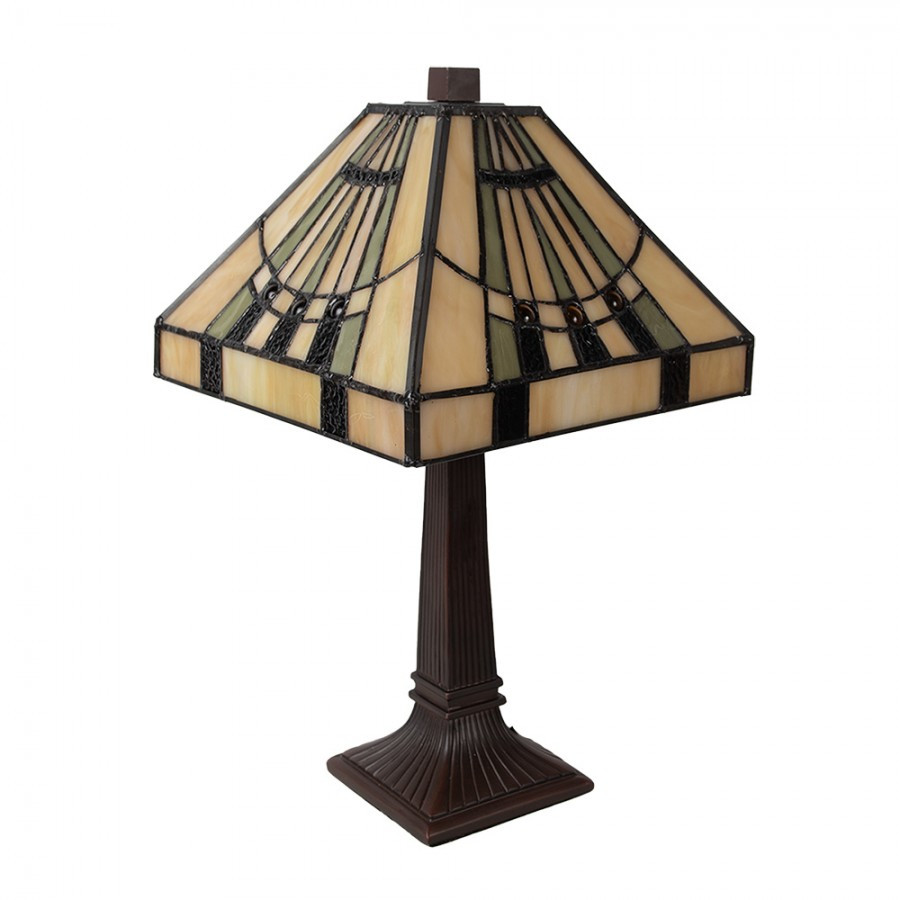 Bronz színű polyresin vázas Tiffany asztali lámpa szögletes, geometrikus, bézs alapon zöld dekoros Tiffany üveg búrával, 1db E14-es foglalattal, vezetékre szerelt kapcsolóval.