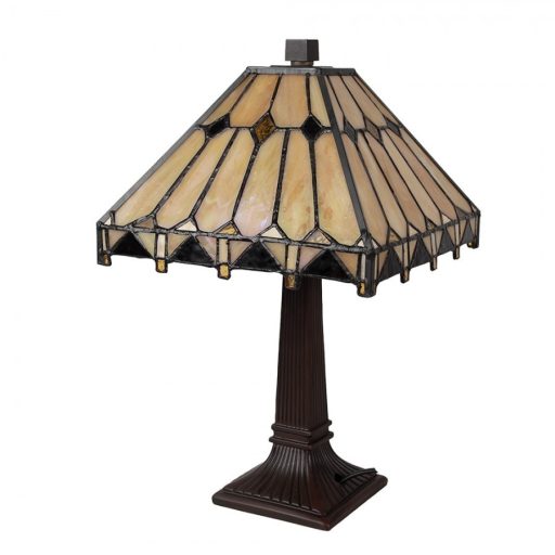 Bronz színű polyresin vázas Tiffany asztali lámpa szögletes, geometrikus, bézs alapon sárga dekoros Tiffany üveg búrával, 1db E14-es foglalattal, vezetékre szerelt kapcsolóval.