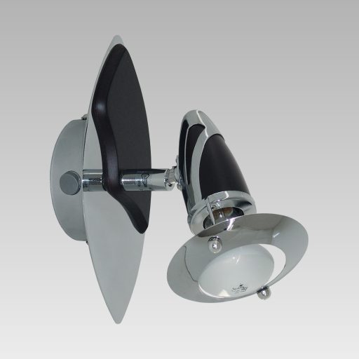 Nikkel színű fém vázas spotlámpa venge színű fa betéttel, állítható fejjel.