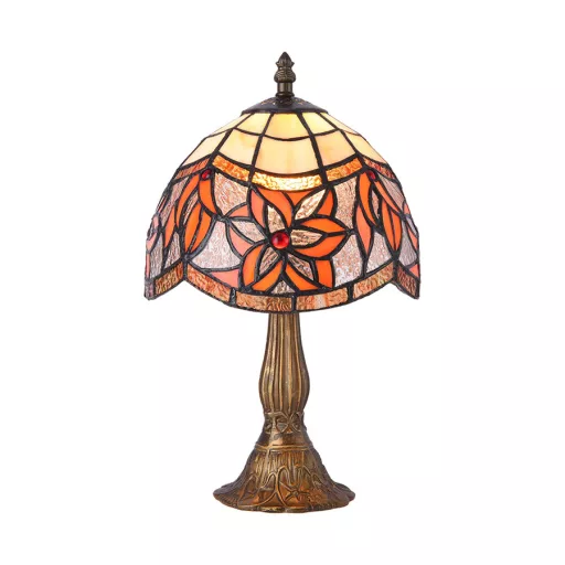 Antik barna színű fém vázas tiffany asztali lámpa bézs-narancs színű Tiffany üveg búrával, E14-es foglalattal, vezetékre szerelt kapcsolóval.