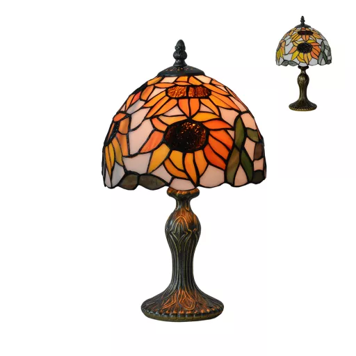 Antik barna színű fém vázas tiffany asztali lámpa bézs-narancs-zöld színű, napraforgó dekoros Tiffany üveg búrával, 1db E14-es foglalattal, vezetékre szerelt kapcsolóval.