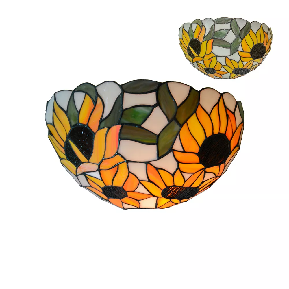 Fém vázas tiffany fali lámpa bézs-narancs-zöld színű, napraforgó dekoros Tiffany üveg búrával, 1db E14-es foglalattal.
