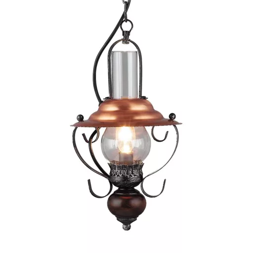 Anitk arany színű fém vázas függeszték réz színű fém és cseresznye színű fa dekoros átlátszó üveg búrával.