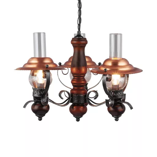 Anitk arany színű fém vázas csillár réz színű fém és cseresznye színű fa dekoros átlátszó üveg búrával.