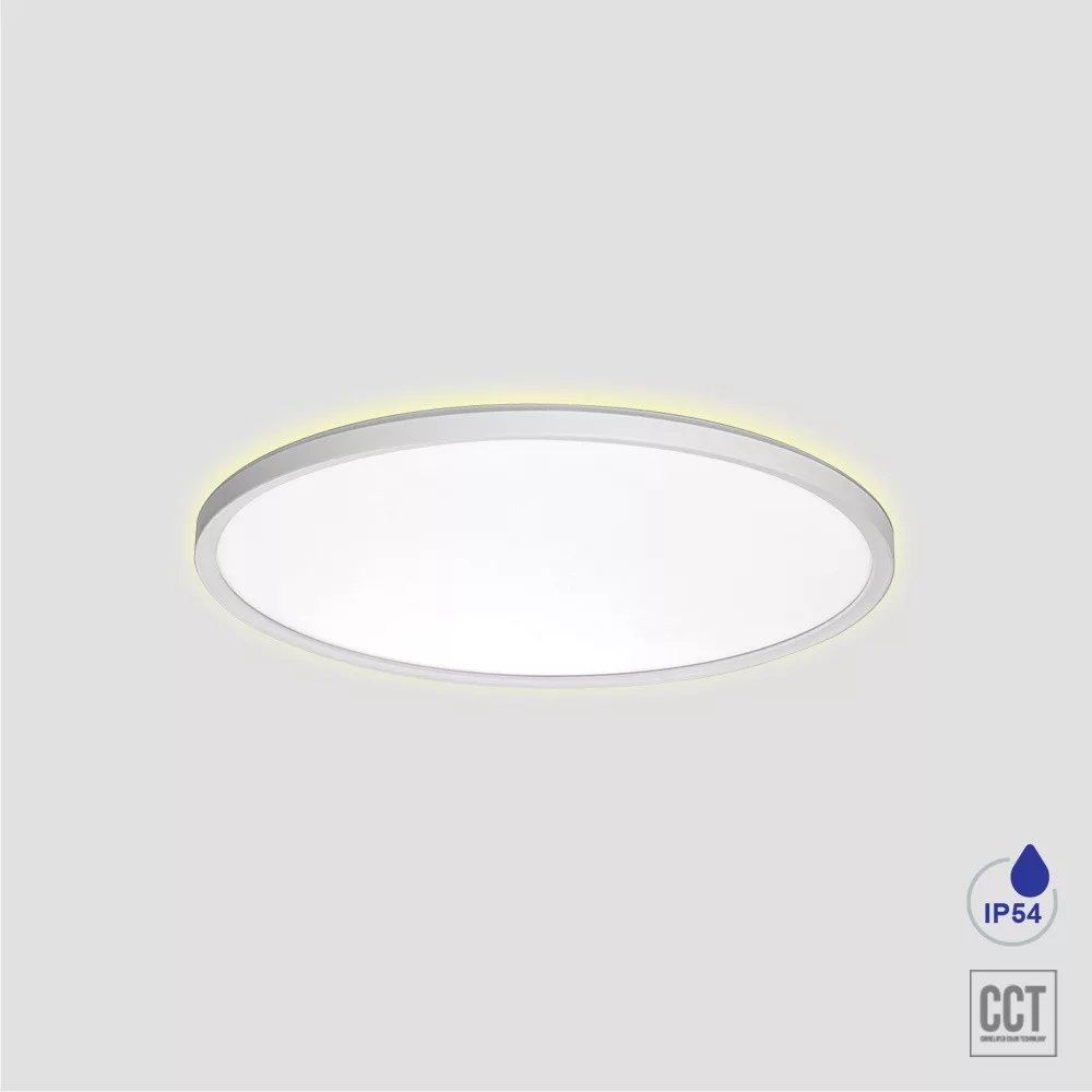 22,5cm átmérőjű, fehér színű műanyag mennyezeti lámpa beépített LED fényforrással, háttér világítással(a mennyezet felé is világít dekorációként), IP54-es védelemmel. A lámpatesten lévő kapcsoló segítségével beállítható a LED színhőmérséklete 3000-6000K-ig 3 lépcsőben (meleg, természetes vagy hideg fehér).