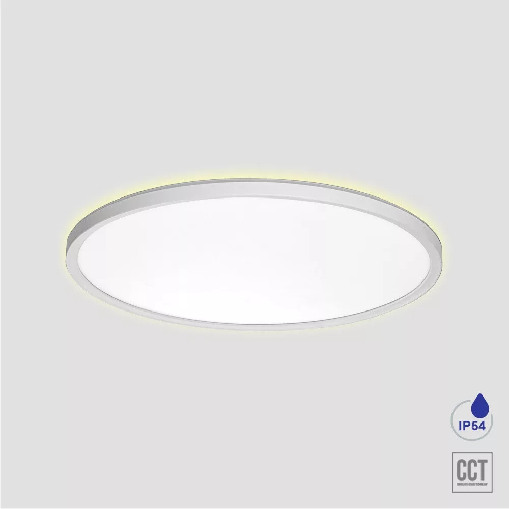 29,5cm átmérőjű, fehér színű műanyag mennyezeti lámpa beépített LED fényforrással, háttér világítással(a mennyezet felé is világít dekorációként), IP54-es védelemmel. A lámpatesten lévő kapcsoló segítségével beállítható a LED színhőmérséklete 3000-6000K-ig 3 lépcsőben (meleg, természetes vagy hideg fehér).