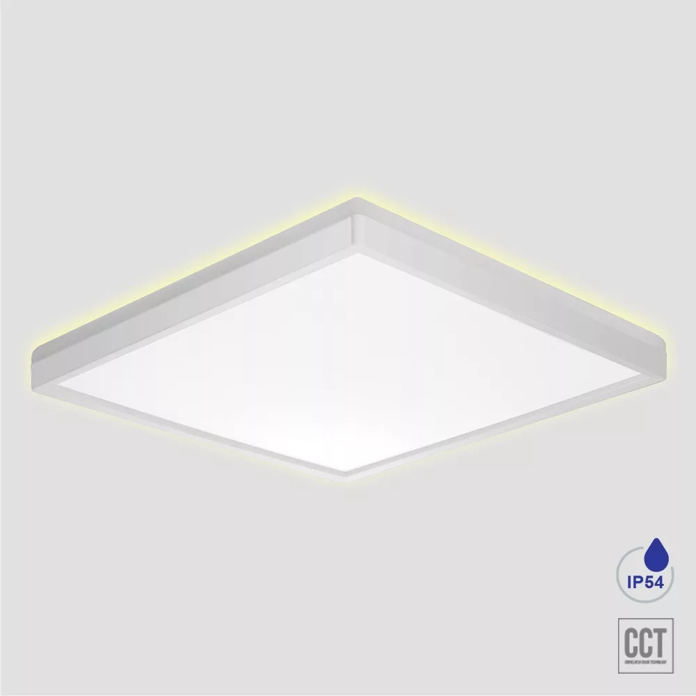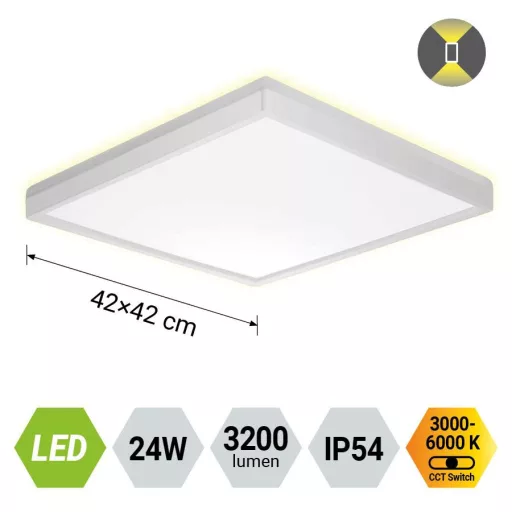 42cm széles, fehér színű műanyag mennyezeti lámpa beépített LED fényforrással, háttér világítással(a mennyezet felé is világít dekorációként), IP54-es védelemmel. A lámpatesten lévő kapcsoló segítségével beállítható a LED színhőmérséklete 3000-6000K-ig 3 lépcsőben (meleg, természetes vagy hideg fehér).