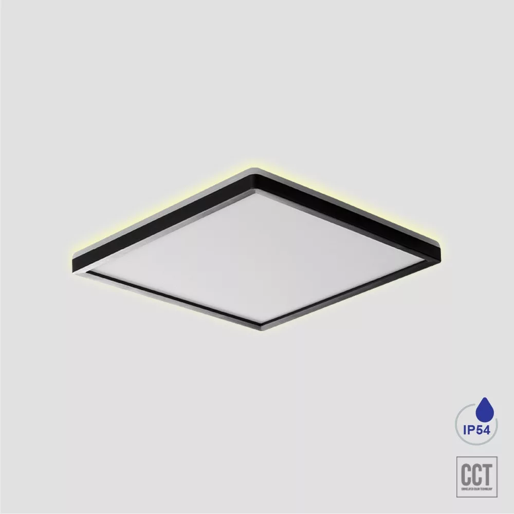 22,5cm széles, fekete-fehér színű műanyag mennyezeti lámpa beépített LED fényforrással, háttér világítással(a mennyezet felé is világít dekorációként), IP54-es védelemmel. A lámpatesten lévő kapcsoló segítségével beállítható a LED színhőmérséklete 3000-6000K-ig 3 lépcsőben (meleg, természetes vagy hideg fehér).