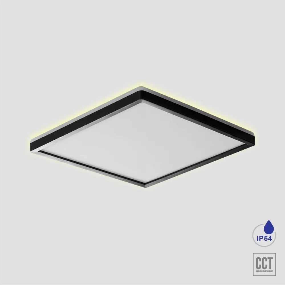 30cm széles, fekete-fehér színű műanyag mennyezeti lámpa beépített LED fényforrással, háttér világítással(a mennyezet felé is világít dekorációként), IP54-es védelemmel. A lámpatesten lévő kapcsoló segítségével beállítható a LED színhőmérséklete 3000-6000K-ig 3 lépcsőben (meleg, természetes vagy hideg fehér).