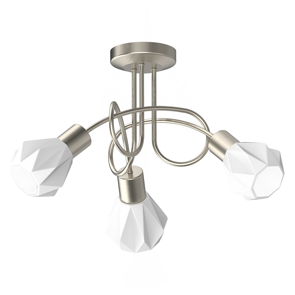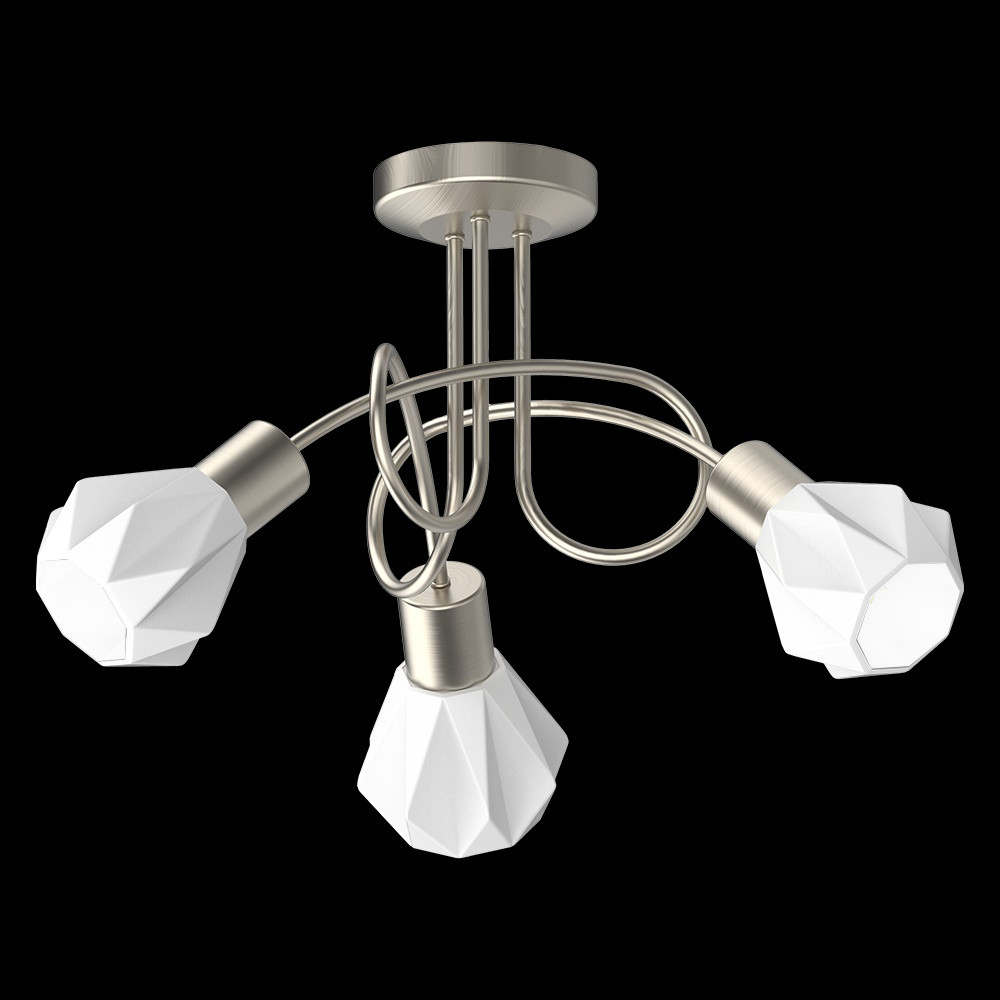 Szatén nikkel színű fém vázas mennyezeti lámpa dekoratív formájú fehér színű üveg búrával, E14-es foglalattal.