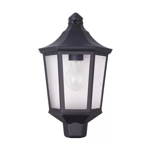 Fekete színű műanyag kültéri fali lámpa műanyag búrával, IP44-es védelemmel.