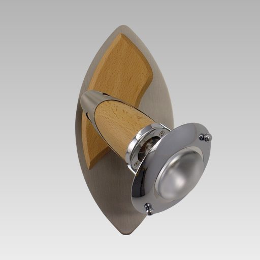 Nikkel színű fém vázas spotlámpa világos színű fa betéttel, állítható fejjel.