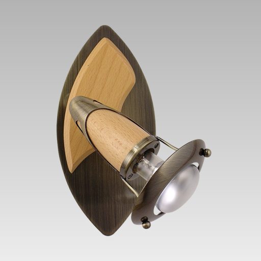 Antik bronz színű fém vázas spotlámpa világos színű fa betéttel, állítható fejjel.