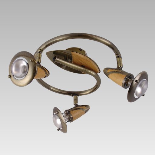 Antik bronz színű fém vázas spotlámpa világos színű fa betéttel, állítható fejjel.