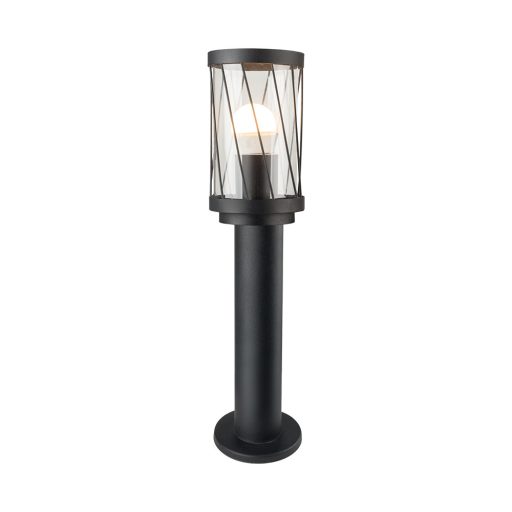 Matt fekete színű alumínium kültéri álló lámpa átlátszó műanyag búrával, IP44-es védelemmel.