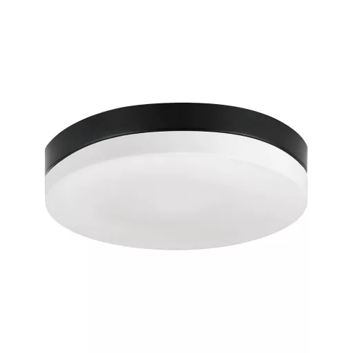 Fekete színű fém vázas fürdőszobai mennyezeti lámpa fehér színű üveg búrával, E27-es foglalattal, IP44-es védelemmel.