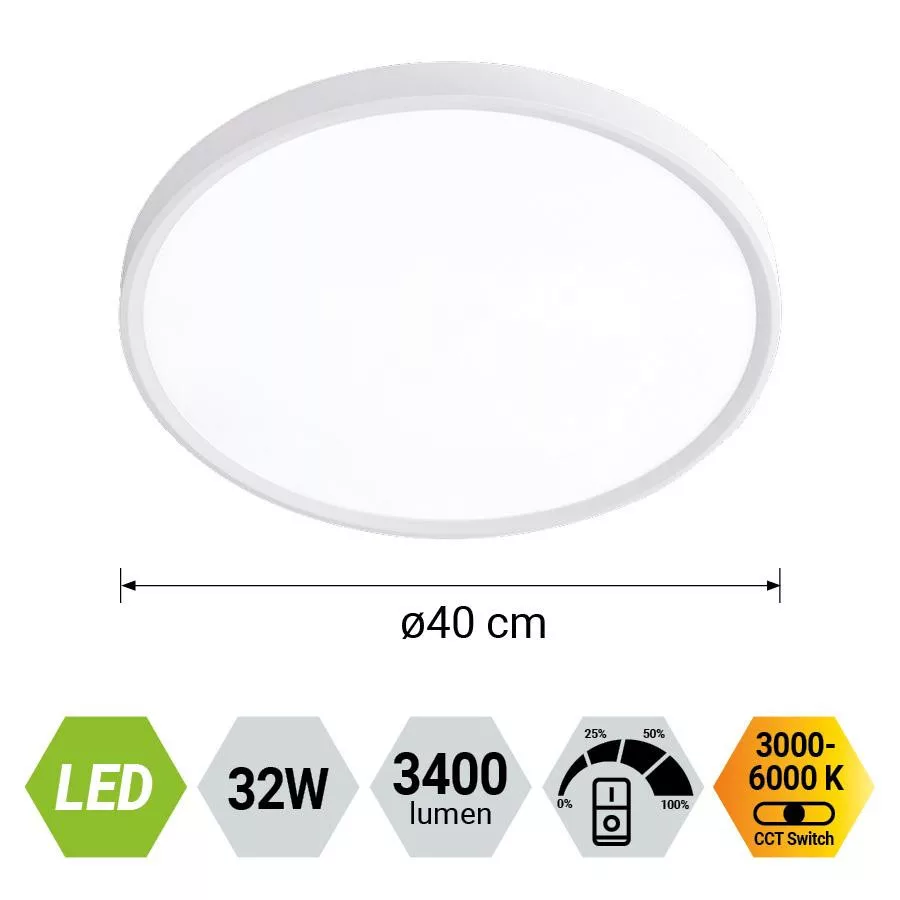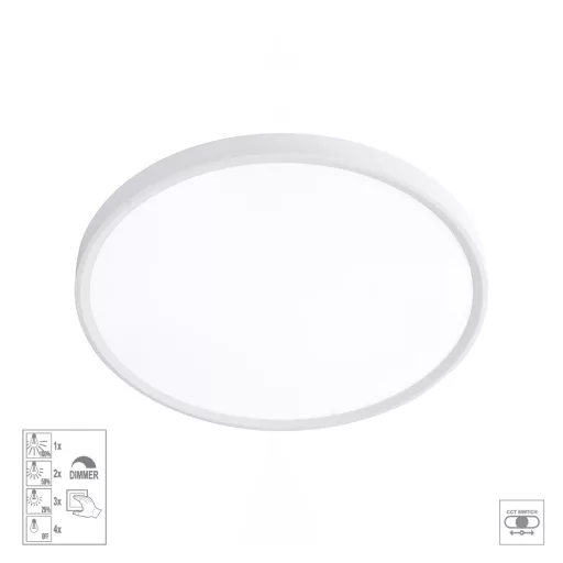40cm átmérőjű, extra vékony, fehér színű műanyag mennyezeti lámpa beépített LED fényforrással. A lámpatesten lévő kapcsoló segítségével beállítható a LED színhőmérséklete 3000-6000K-ig 3 lépcsőben (meleg, természetes vagy hideg fehér). A lámpa fényereje fali kapcsoló fel/le kapcsolásával 3 lépcsőben szabályozható.