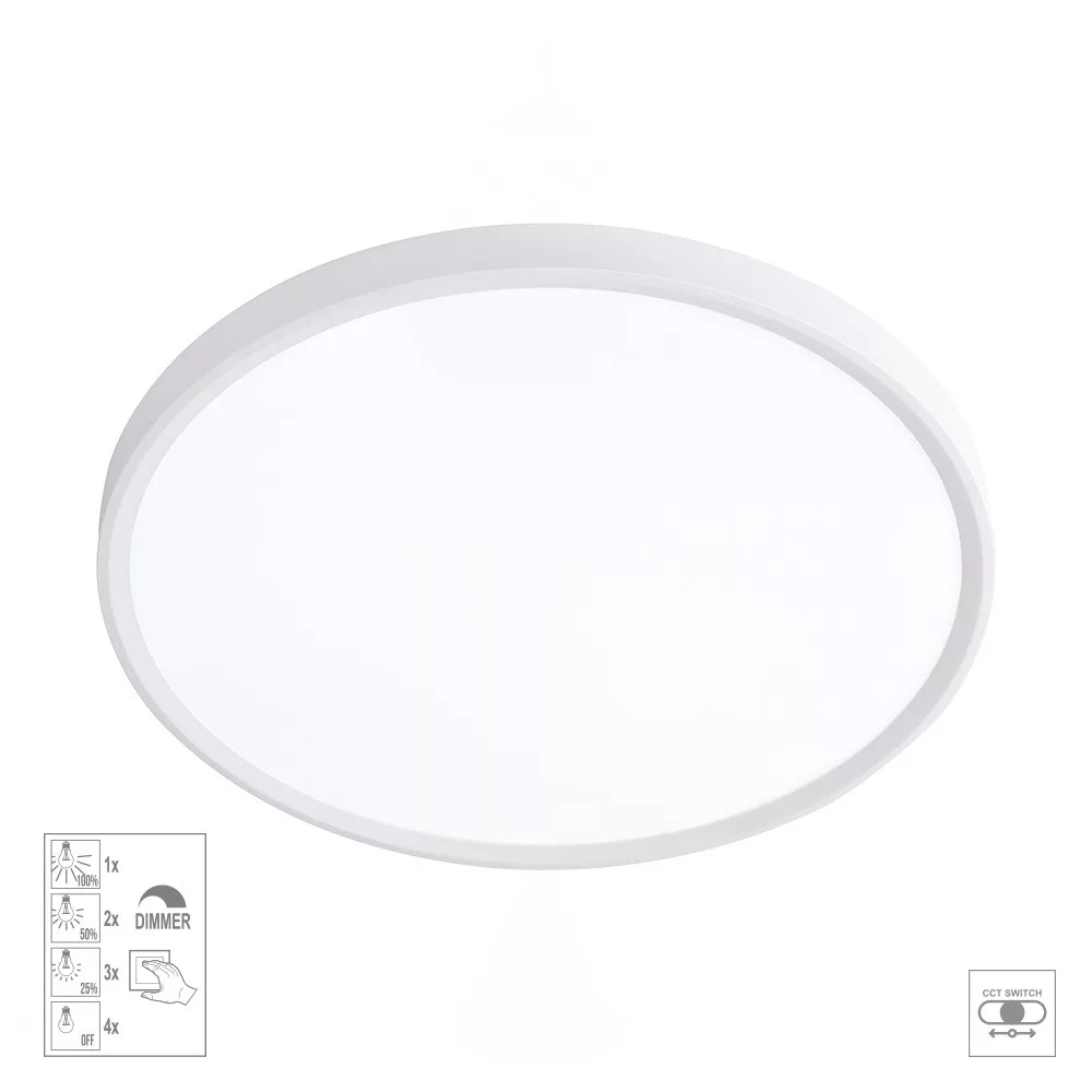 50cm átmérőjű, extra vékony, fehér színű műanyag mennyezeti lámpa beépített LED fényforrással. A lámpatesten lévő kapcsoló segítségével beállítható a LED színhőmérséklete 3000-6000K-ig 3 lépcsőben (meleg, természetes vagy hideg fehér). A lámpa fényereje fali kapcsoló fel/le kapcsolásával 3 lépcsőben szabályozható.