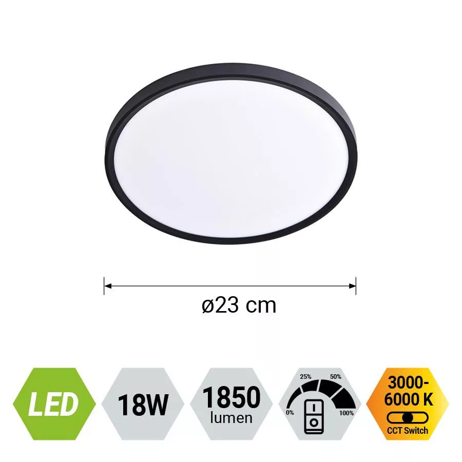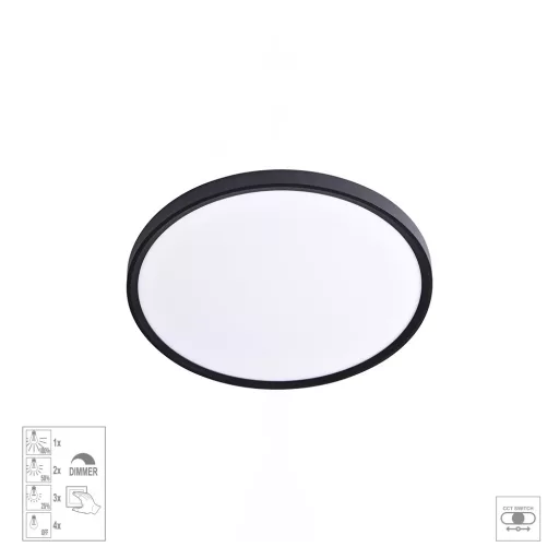 23cm átmérőjű, extra vékony, fekete-fehér színű műanyag mennyezeti lámpa beépített LED fényforrással. A lámpatesten lévő kapcsoló segítségével beállítható a LED színhőmérséklete 3000-6000K-ig 3 lépcsőben (meleg, természetes vagy hideg fehér). A lámpa fényereje fali kapcsoló fel/le kapcsolásával 3 lépcsőben szabályozható.