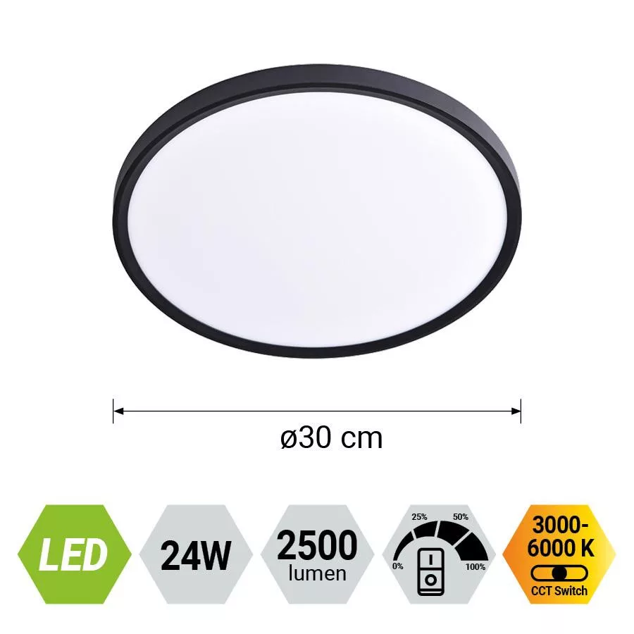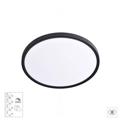 30cm átmérőjű, extra vékony, fekete-fehér színű műanyag mennyezeti lámpa beépített LED fényforrással. A lámpatesten lévő kapcsoló segítségével beállítható a LED színhőmérséklete 3000-6000K-ig 3 lépcsőben (meleg, természetes vagy hideg fehér). A lámpa fényereje fali kapcsoló fel/le kapcsolásával 3 lépcsőben szabályozható.