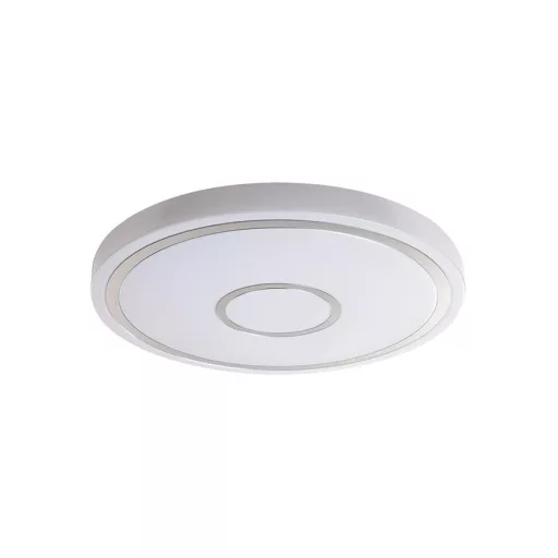 Fehér színű fém vázas mennyezeti lámpa fehér színű akril búrával, króm dekorral.