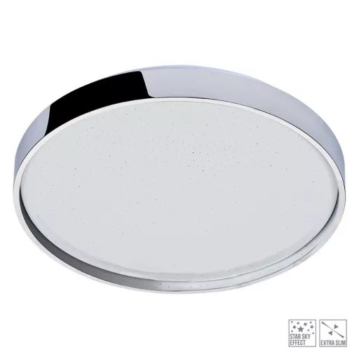 Króm színű fém vázas mennyezeti lámpa csillagos égbolt effektes, fehér színű műanyag búrával, 36W hideg fehér fényű beépített LED fényforrással, IP44-es védelemmel.