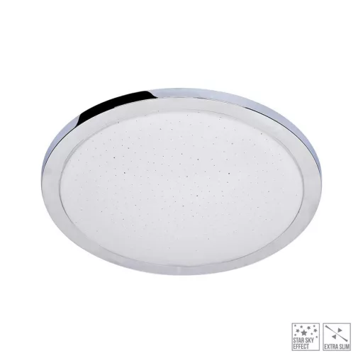 Króm színű fém vázas mennyezeti lámpa csillagos égbolt effektes, fehér színű műanyag búrával, 18W hideg fehér fényű beépített LED fényforrással, IP44-es védelemmel.