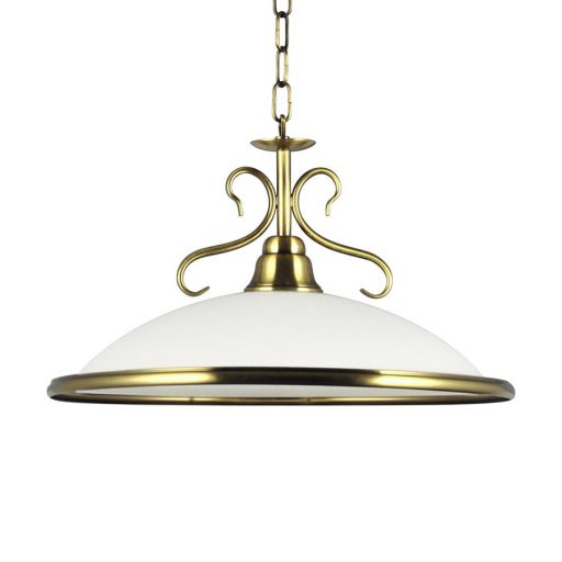 Arany-bronz színű fém vázas függeszték fehér színű üveg búrával.