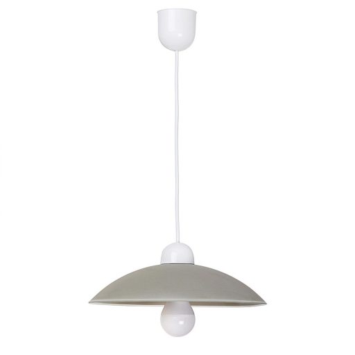 Időtlen megjelenésű függeszték fix kivitelű, 90 cm-es, fehér színű műanyag függesztékkel és 32,5 cm-es ármérőjű, íves kialakítású, szürke színű üvegbúrával. Az IP20-as védettséget adó lámpatest E27-es foglalatkialakítású, max. 60W teljesítményű fényforrással használható.