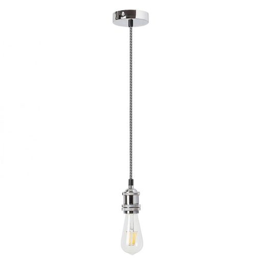 Indusztiális stílusú, búra nélküli függeszték, ezüst színű fém vázzal, fekete fehér mintás textil kábellel. Dekor fényforrást ajánlunk hozzá a tökéletes öszzhatás végett.