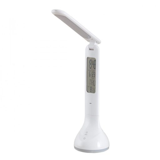 Justin, modern, LED-es asztali lámpa, az alján színváltós LED hangulatfénnyel, beépített akkumulátorral és idő/dátum/hőmérséklet kijelzővel. A lámpa összecsukható, fényerőszabályzós, USB bemeneten keresztül tölthető, ébresztő és születésnap emlékeztető funkcióval felszerelt.