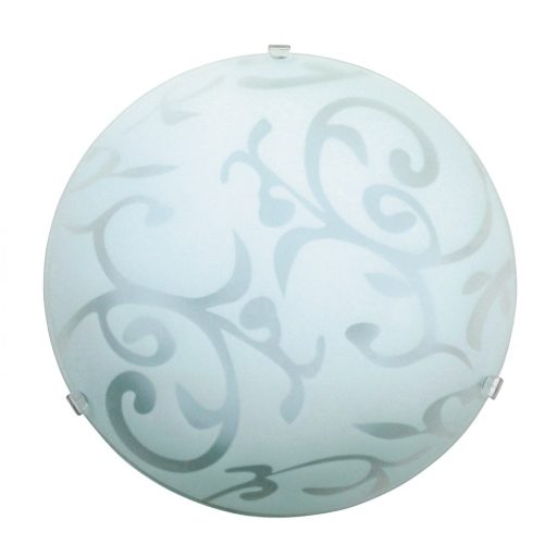 Modern stílusú fali/mennyezti lámpa, fém vázzal, fehér színű, inda szerű, átlátszó mintás üveg búrával.
