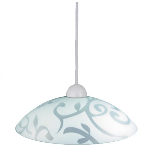 Modern stílusú függeszték, fehér színű műanyag vázzal, fehér színű, átlátszó mintás üveg búrával.
