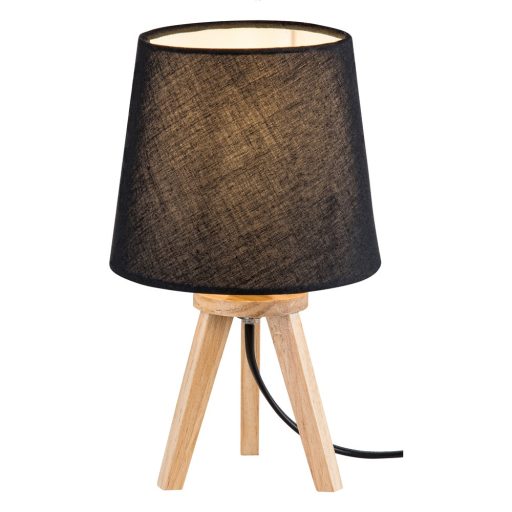 Világos fa vázas éjjeli lámpa fekete színű textil lámpaernyővel, 1db E14-es foglalattal, vezetékre szerelt kapcsolóval.