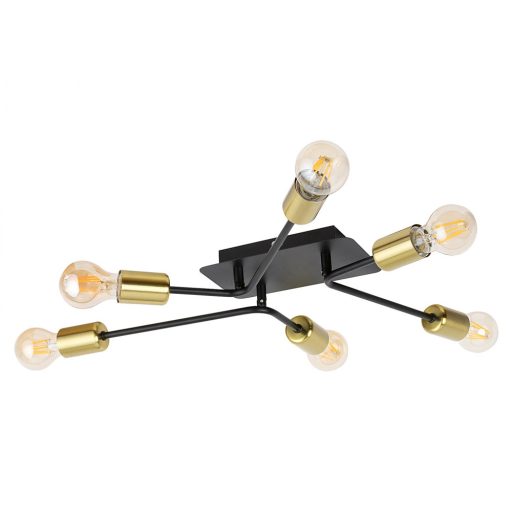 Indusztriális stílusú mennyezeti lámpa 6 db foglalattal. 60 cm széles, fekete és arany színű, fémből készített szerkezet IP20-as védettséggel. A lámpatest E27-es foglalatkialakítású, 6x max. 15W teljesítményű, kizárólag energiatakarékos izzókkal használható.