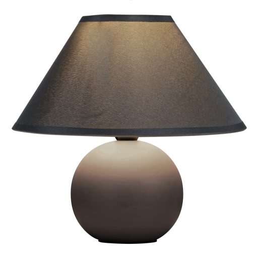 Kis méretű, szürke színű kerámia vázas asztali lámpa textil lámpaernyővel, 1db E14-es foglalattal, vezetékre szerelt kapcsolóval.
