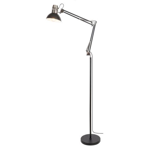 Matt fekete és ezüst színű fém vázas álló lámpa 2 ponton dönthető karral és billethető fejjel, 1db E27-es foglalattal, vezetékre szerelt kapcsolóval. A lámpa fényforrást nem tartalmaz.