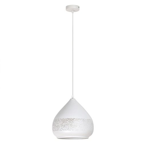 Trópusi stílusú függeszték 1 db foglalattal. 110 cm lelógású, 27 cm búraátmérőjű fém szerkezet fehér színben. A lámpatest E27-es foglalatkialakítású, max. 40W teljesítményű fényforrással használható.