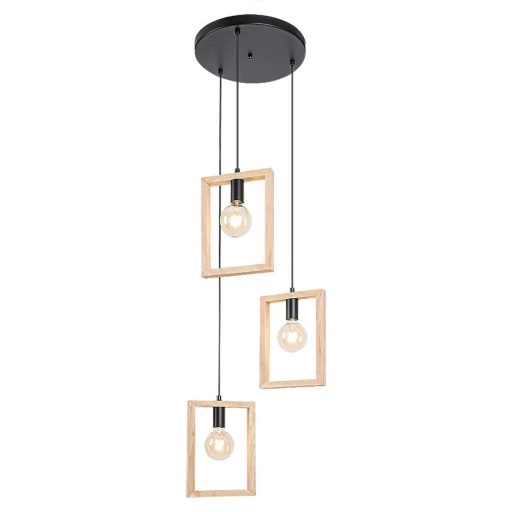 Fekete színű fém vázas függeszték lámpa natúr fa kerettel, E27-es foglalattal. A lámpa dekor fényforrással mutat a legjobban, ami nem tartozék.